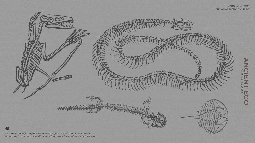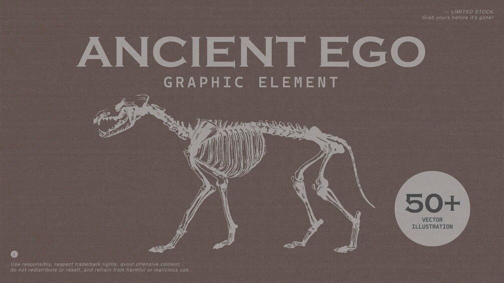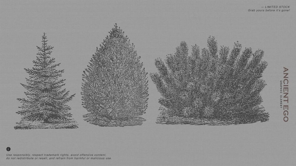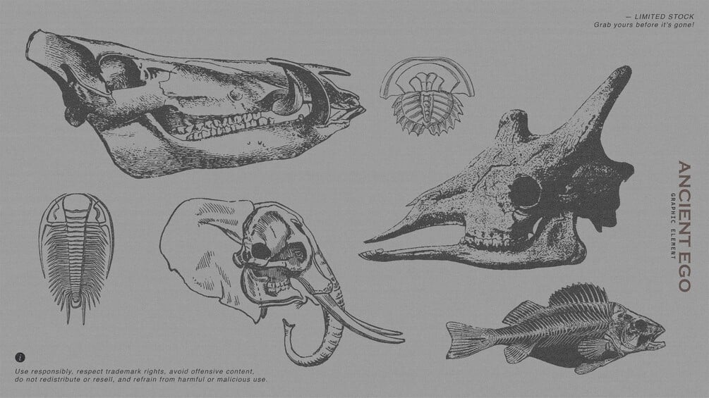 This pack is for anyone who’s into raw, ancient, and nature-inspired visuals. ANCIENT EGO includes 50+ vector illustrations — animal skulls, trees, flowers, and other wild elements — perfect for adding a dark, organic touch to your designs.